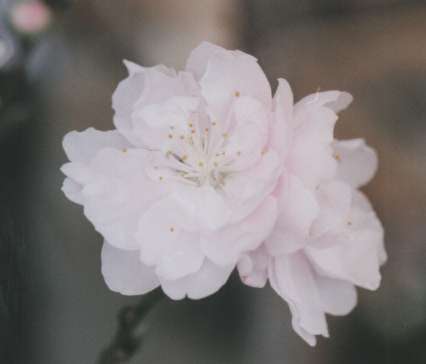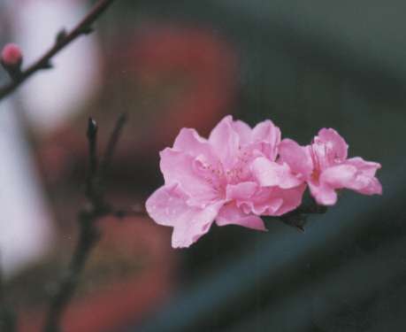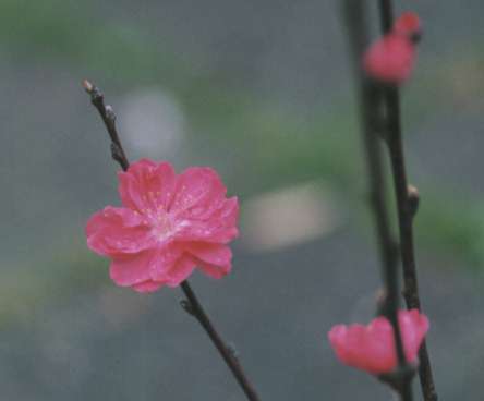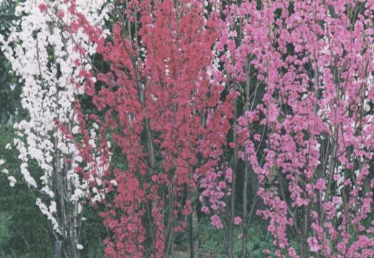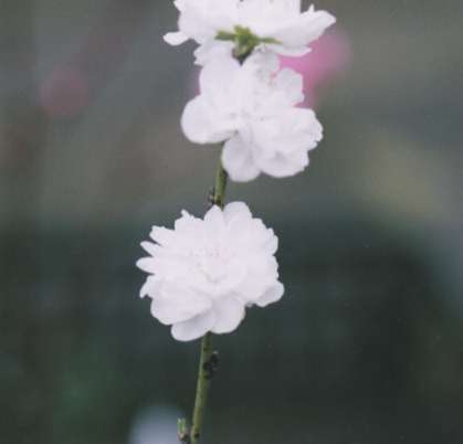 桃の園芸品種。庭木、切花用として栽培される落葉潅木。花弁は八重崎咲き、濃紅色または純白。果実は小型。