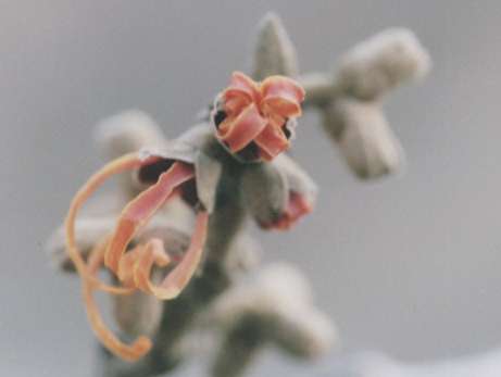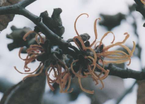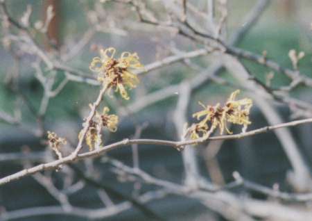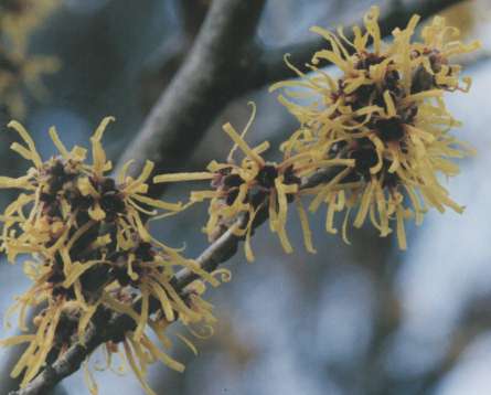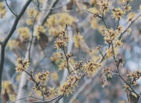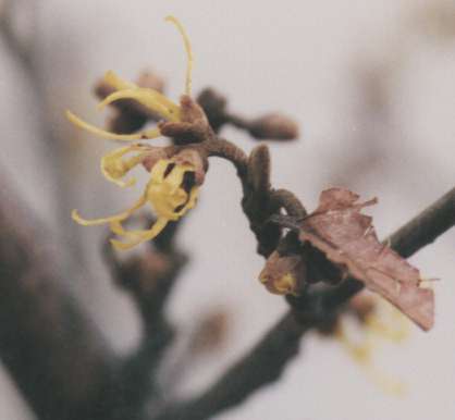 マンサク科の落葉潅木。高さ3m位。山地に自生。葉は楕円形でやや先が広い。茶花として栽培、花季が早い(2月)ので珍重される。早春、黄色・線形の四弁花を開き、楕円形のサツ果を結ぶ。葉を止血剤とする。(広辞苑より)