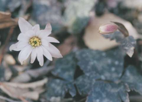 キンポウゲ科の多年草。冬、福寿草に先立って花開く。一茎一花。